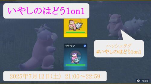 大会告知画像 1枚目 ポケットモンスタースカーレット・バイオレットの仲間大会を開催します。 「いやしのはどう1on1」 いやしのはどうだけを覚えたポケモンの1対1の戦いです。 大会概要 ルール 参加者の方へのお願い 形式 参加方法 景品 Q&A 大会考察の手助…