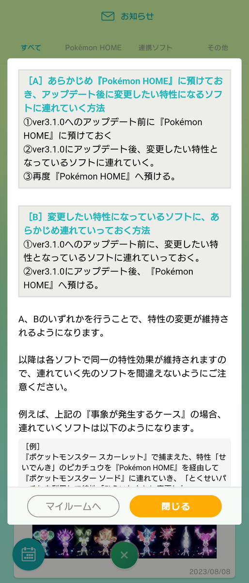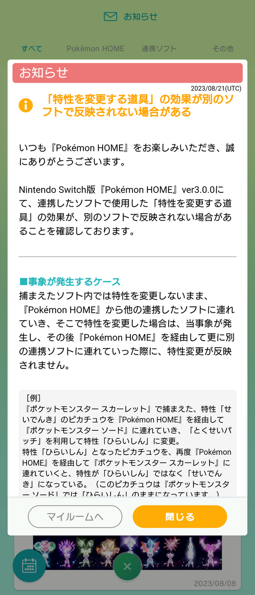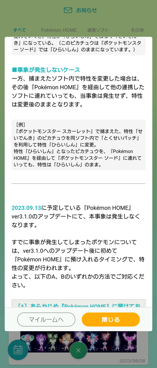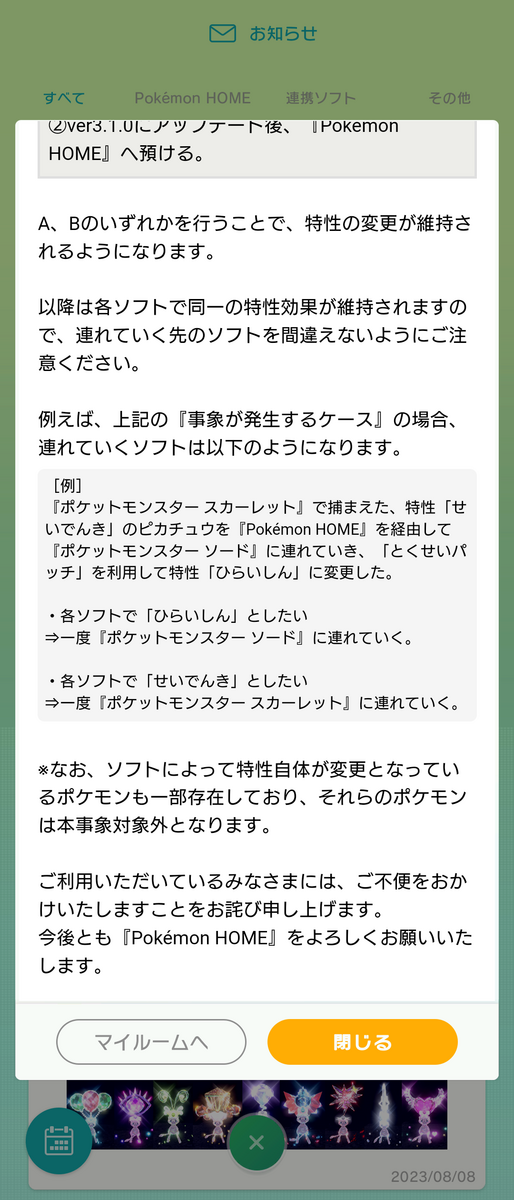 今回起きた出来事 2023年8月 ポケモンHOME「お知らせ」